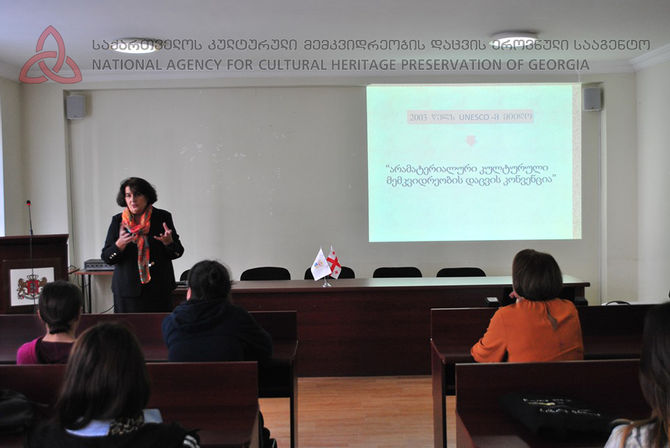 მიმდინარე წლის 22 ოქტომბერს, საქართველოს კულტურული მემკვიდრეობის დაცვის ეროვნული სააგენტოს არამატერიალური კულტურული მემკვიდრეობის სპეციალისტმა მაკა თაქთაქიშვილმა, სოხუმის სახელმწიფო უნივერსიტეტში გამართა სამუშაო შეხვედრა-ტრენინგი უნივერსიტეტის სტუდენტებსა და პროფესორ-მასწავლებლებთან. შეხვედრას დაესწრო 50-ზე მეტი მსმენელი. მათ მოისმინეს პრეზენტაცია საქართველოში არამატერიალური მემკვიდრეობის დაცვის მექანიზმებისა და ამ სფეროში საერთაშორისო გამოცდილების შესახებ. შეხვედრის ბოლოს გაიმართა საინტერესო დისკუსია ქართული არამატერიალური მემკვიდრეობის მოძიებისა და ფიქსაციის შესაძლებლობების შესახებ, დაისახა ამ მიმართულებით შემდგომი თანამშრომლობის საინტერესო პერსპექტივები.